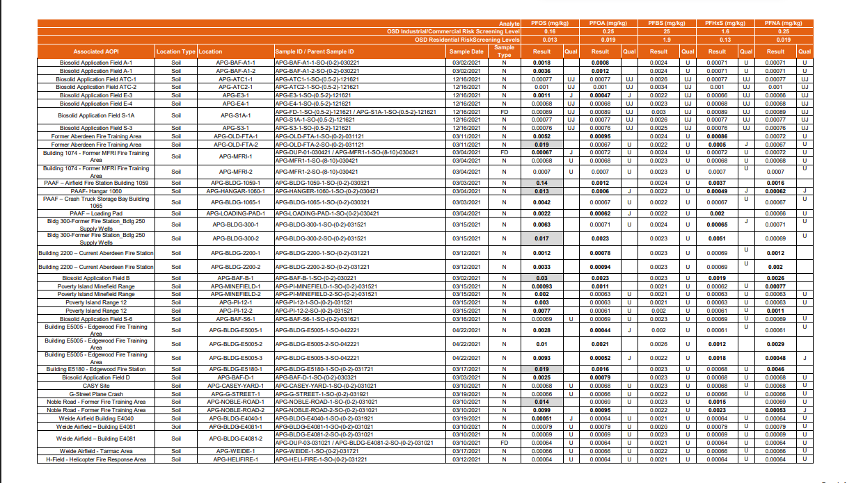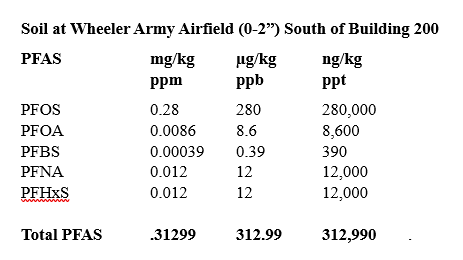 A typical page may look like this, while the Army prefers to measure PFAS in soils in mg/kg - miligrams per kilogram, or parts per million. We must multiply these numbers by 1,000,000 to arrive at the publicly recognizable parts per trillion.