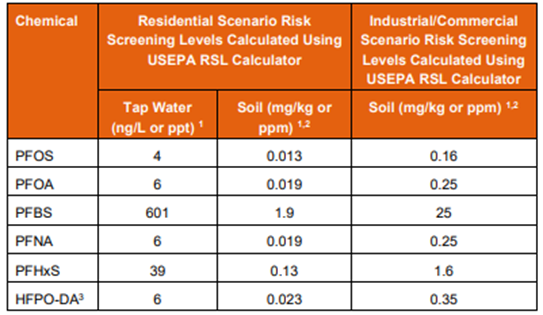 Notes: 1. Risk screening levels for tap water and soil provided by the Office of the Secretary of Defense, 2022. Memorandum: Investigating Per- and Polyfluoroalkyl Substances within the Department of Defense Cleanup Program. July 06 (Appendix A).