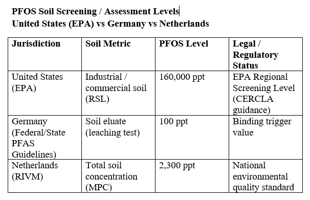 Germany has binding PFAS assessment guidelines that regulate both groundwater and the soil–to–groundwater pathways. This is something the EPA and its “partner” the Army, do not seriously pursue. Under German guidelines, PFOS in groundwater has a “trigger value” of 100 ppt. the level at which remediation or further investigation becomes mandatory.