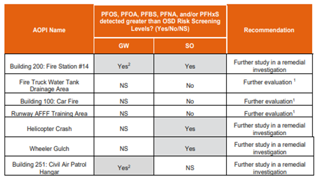2. The existing monitoring well sampled during the PA/SI was in close proximity to both Building 200: Fire Station #14 AOPI and Building 251: Civil Air Patrol Hangar AOPI. Therefore, the groundwater results were used to evaluate and recommend both AOPIs for further study in a remedial investigation.