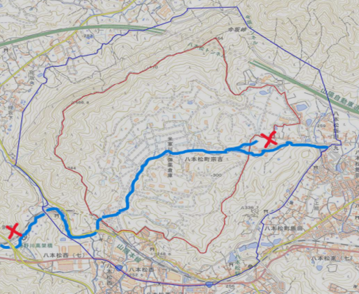 The red boundary shows the perimeter of the U.S. Army Kawakami Ammunition Depot. A tributary of the Seno River cuts across the facility, flowing from the northeast to the southwest. The X on the left shows where we took a water sample from the Seno River while the X on the right shows the location of Hachihonmatsu-cho, where the infamous well sample was collected.