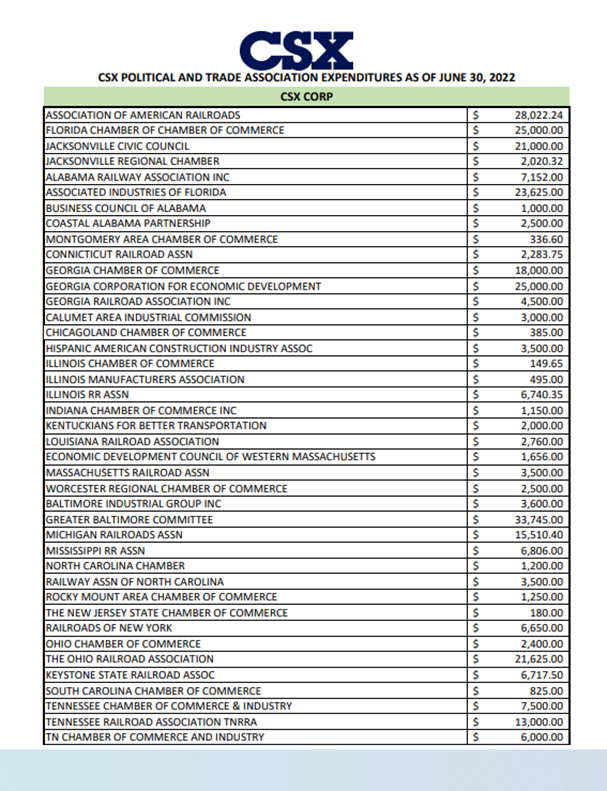 See the CSX Political and Trade Association Expenditures as of June 30, 2022 here and below.