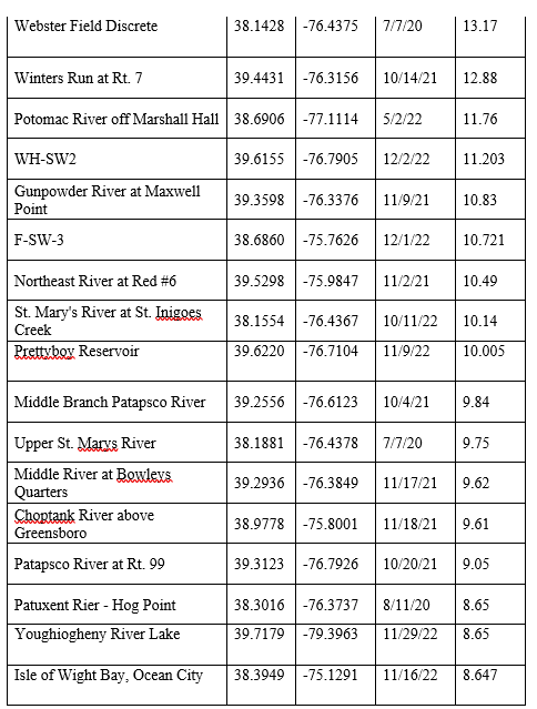 Many were shocked two years ago when the Maryland Department of the Environment, (MDE) published results showing PFAS contamination in Piscataway Creek flowing out of Joint Base Andrews at 3,193 parts per trillion. After all, it only requires PFOS in single digits in the water to begin the bioaccumulation process in fish. The levels draining from the Naval Research Laboratory-Chesapeake Bay Detachment in Chesapeake Beach are three times higher, according to the newly released results. The MDE has banned consumption of several species of fish in Piscataway Creek, but there are no fish advisories for the Chesapeake Bay.