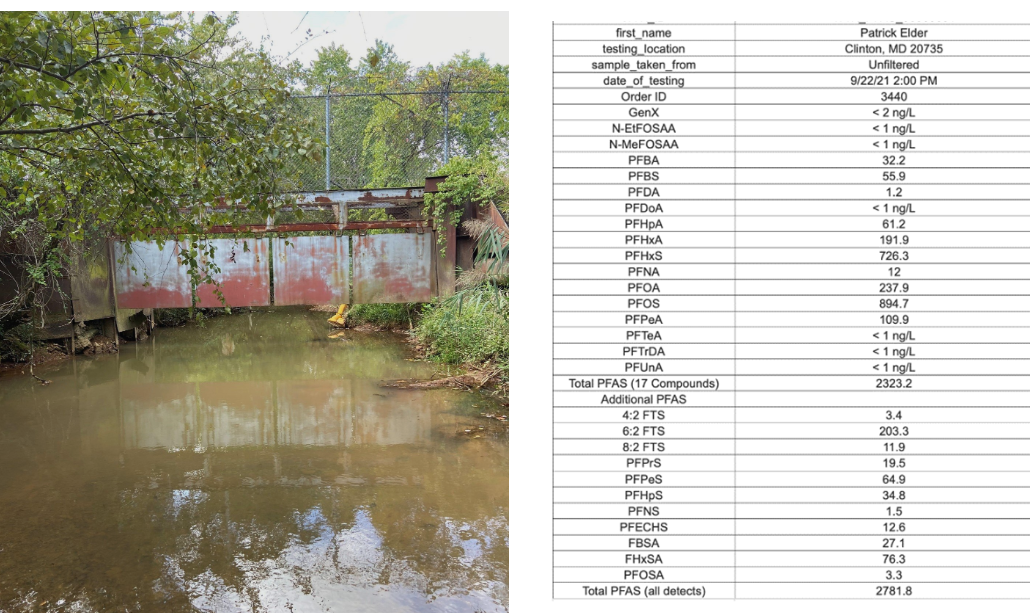 In September of 2021 local environmentalist Sherman Hardy and I tested the water from Piscataway Creek as it flowed out of the base. We received our results in 10 days. We sent the results to a host of individuals with the Maryland Department of the Environment, the Prince George’s County Council, and the Maryland General Assembly. No one wanted to hear from us. I had been hounding MDE for two years to test the water and the fish in Piscataway Creek. See the photo of the spot where we collected a sample and our results.