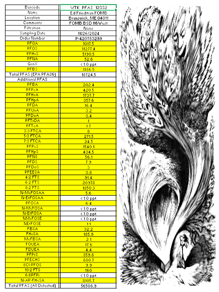 This chart shows the levels of PFAS compounds released into Brunswick’s environment from Hangar 4 on August 19, 2024. These are the highest levels recorded anywhere on earth for these compounds. PFOS alone had a concentration of 3.78 billion parts per trillion, meaning this may haunt Brunswick for a thousand years.