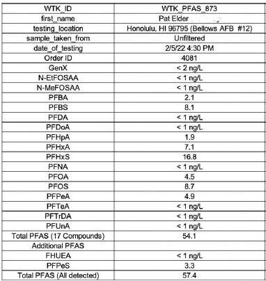 Sample “Landing Zone-02” contained a total of 9,242.4 ng/L (ppt) of PFAS in groundwater. The 2,800 ng/l is 700 times over the EPA standard. It is a minor concentration compared to the 2.8 million ppt reported by the Navy at Pearl Harbor.