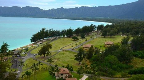 Aerial view of the Bellows Air Force Station coastal recreation area along Waimānalo Bay on Oʻahu.